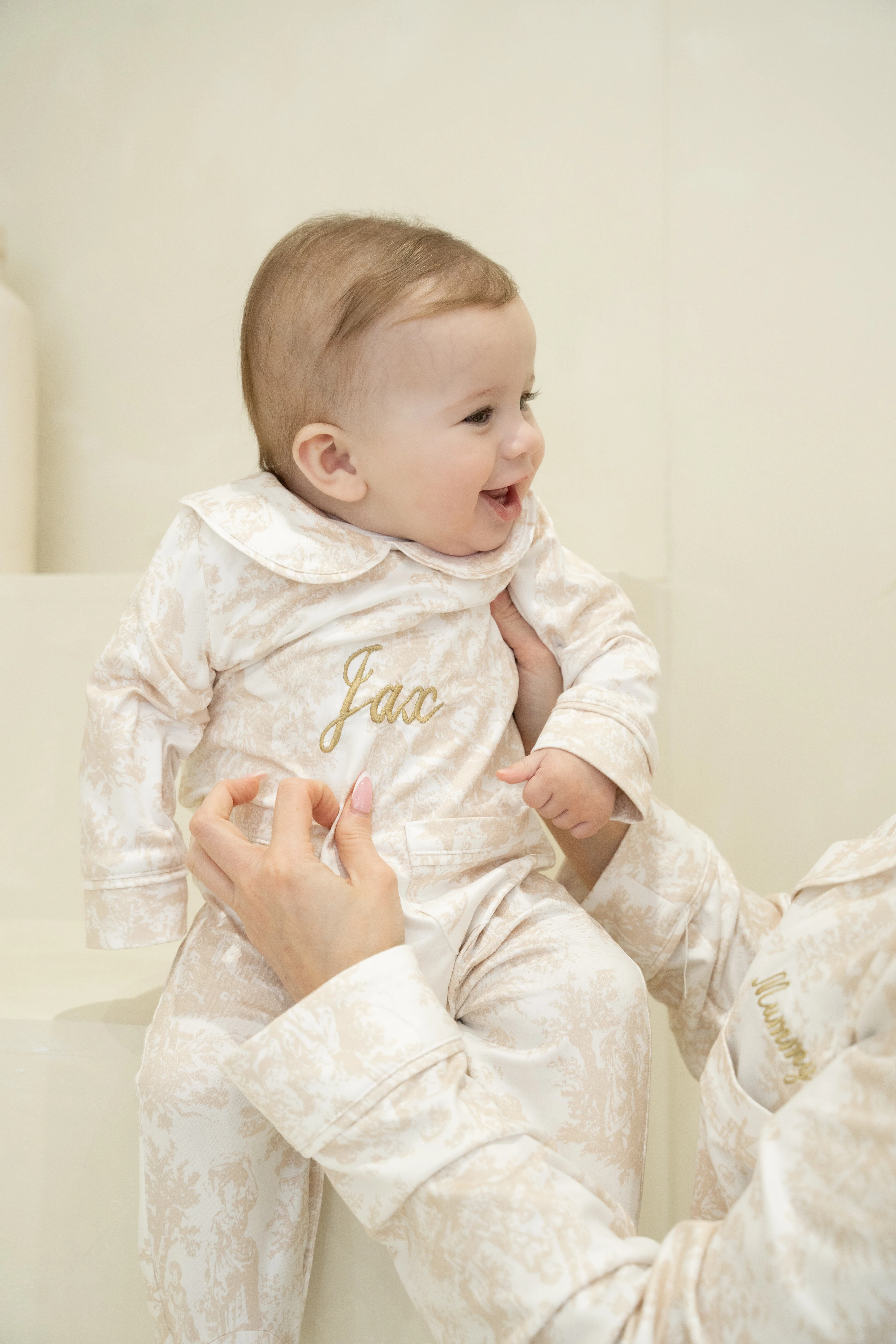 Baby Boy Personalised Neutral Toile De Jouy Luxury Jersey Babygrow