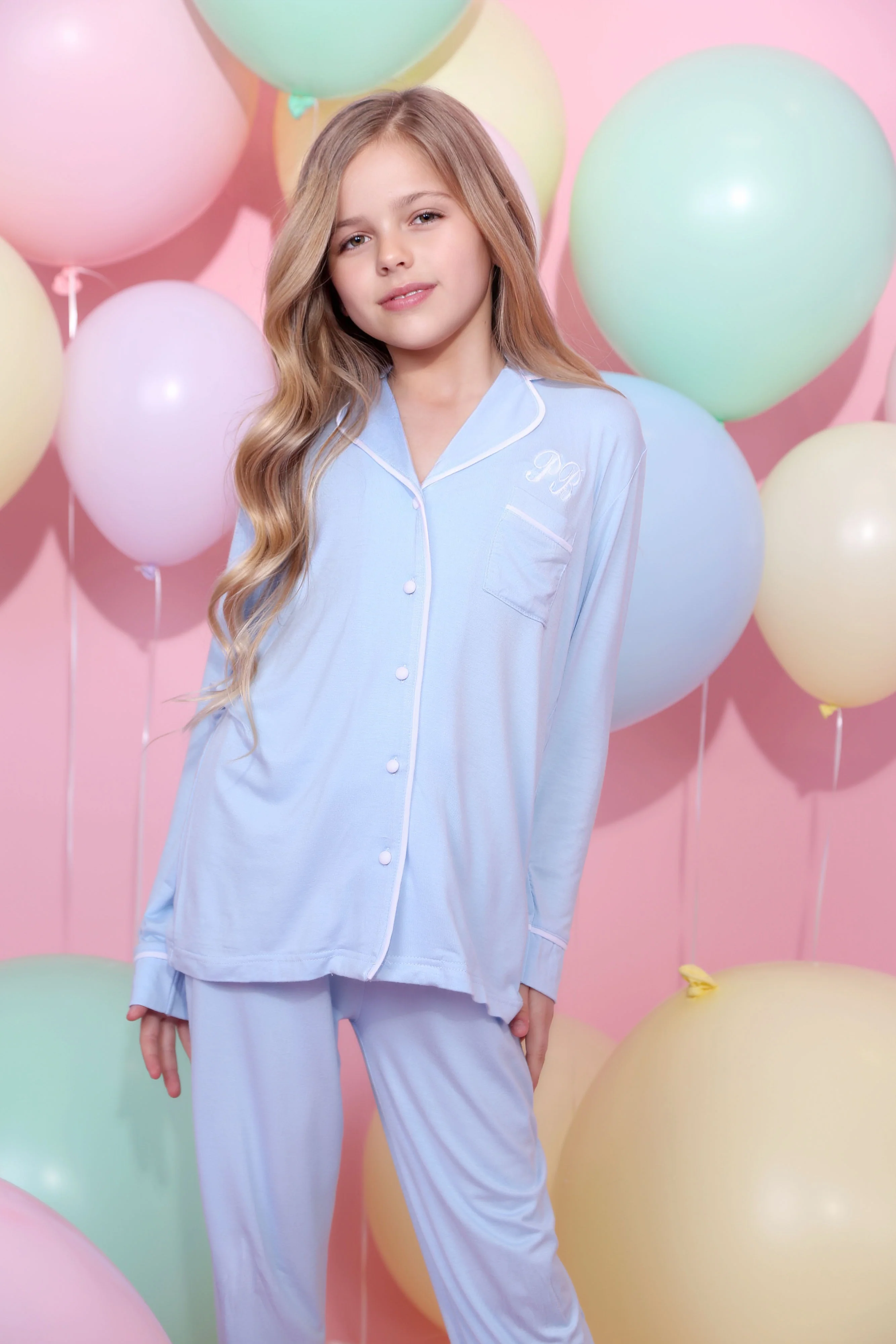 Introducing the NEW Pastel Mini & Mama range of personalised pyjamas to The Sleepover Club. Personalised pyjamas from The Sleepover Club are the ultimate, classic nightwear and a must have for Mamas & Minis.Shop the classic pastel blue pants set in luxury jersey with white contrast piping and drawstring tie waist. Available in sizes 1-2yrs, 3-4yrs, 5-6yrs, 7-8yrs, 9-10yrs & 11-12yrs.Made with 97% Viscose and 3% Elastane to bring you the ultimate comfort.